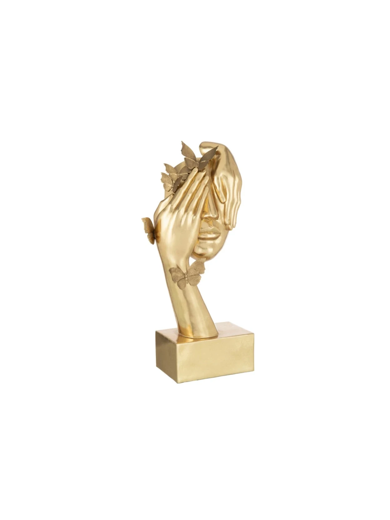 Opera decorativa che fonde arte, eleganza e significato simbolico. Raffinato e scenografico, raffigura un volto femminile avvolto da delicate farfalle, simbolo di trasformazione e rinascita, in una finitura completamente dorata che sprigiona luce e raffinatezza. Realizzato in poliresina di alta qualità, questo oggetto d’arredo unisce resistenza e cura del dettaglio, con un design che non passa inosservato. Il colore oro, intenso e luminoso, lo rende un pezzo importante, capace di diventare protagonista in qualsiasi spazio, dal living moderno alla camera da letto, fino a studi e ingressi. Con i suoi 54,5 cm di altezza, è una scultura imponente ma armoniosa, ideale per essere esposta su consolle, tavolini o mobili d’accento. La sua presenza arricchisce gli interni con un tocco di lusso contemporaneo e sofisticato, trasmettendo al tempo stesso poesia e leggerezza.