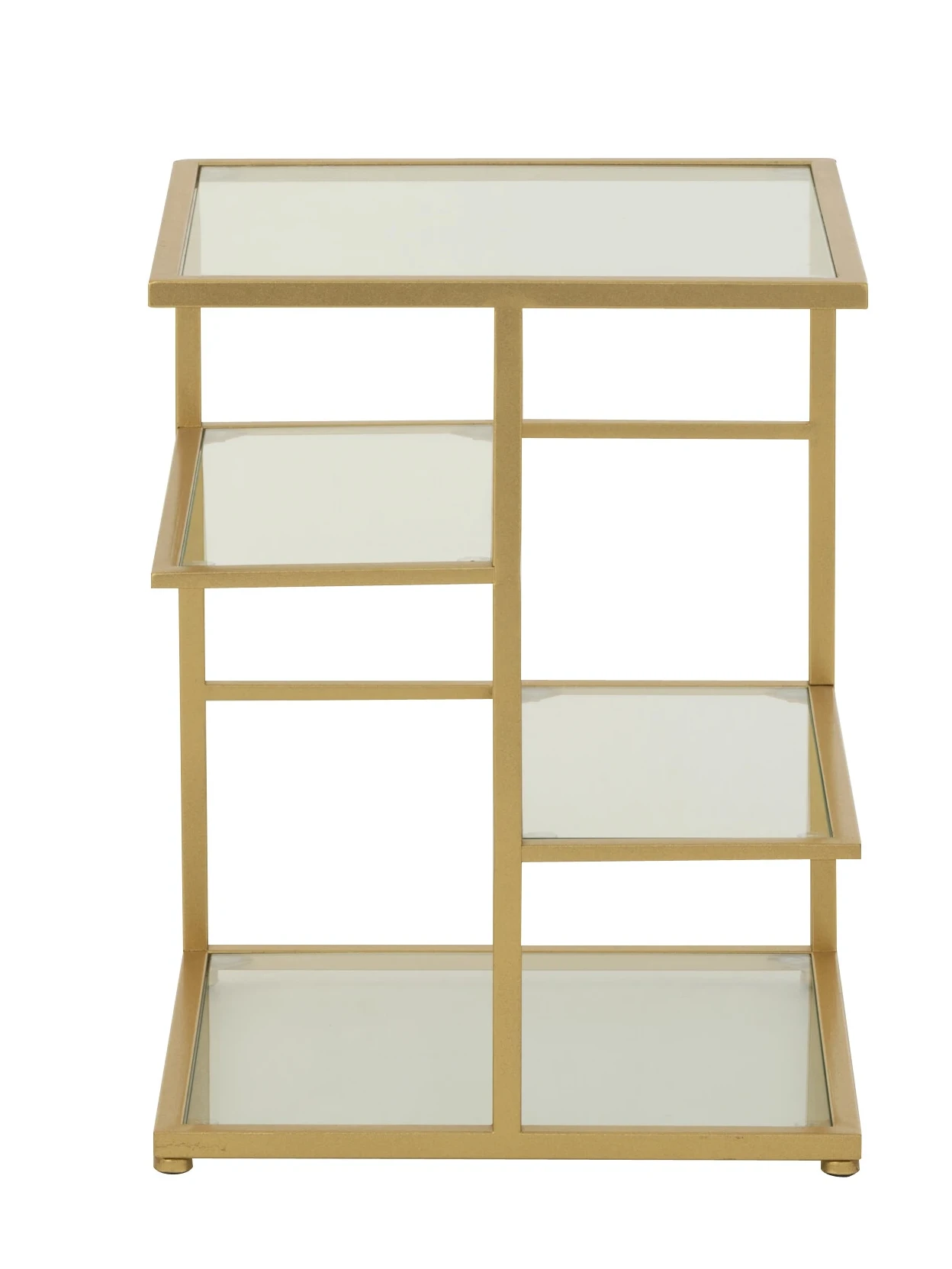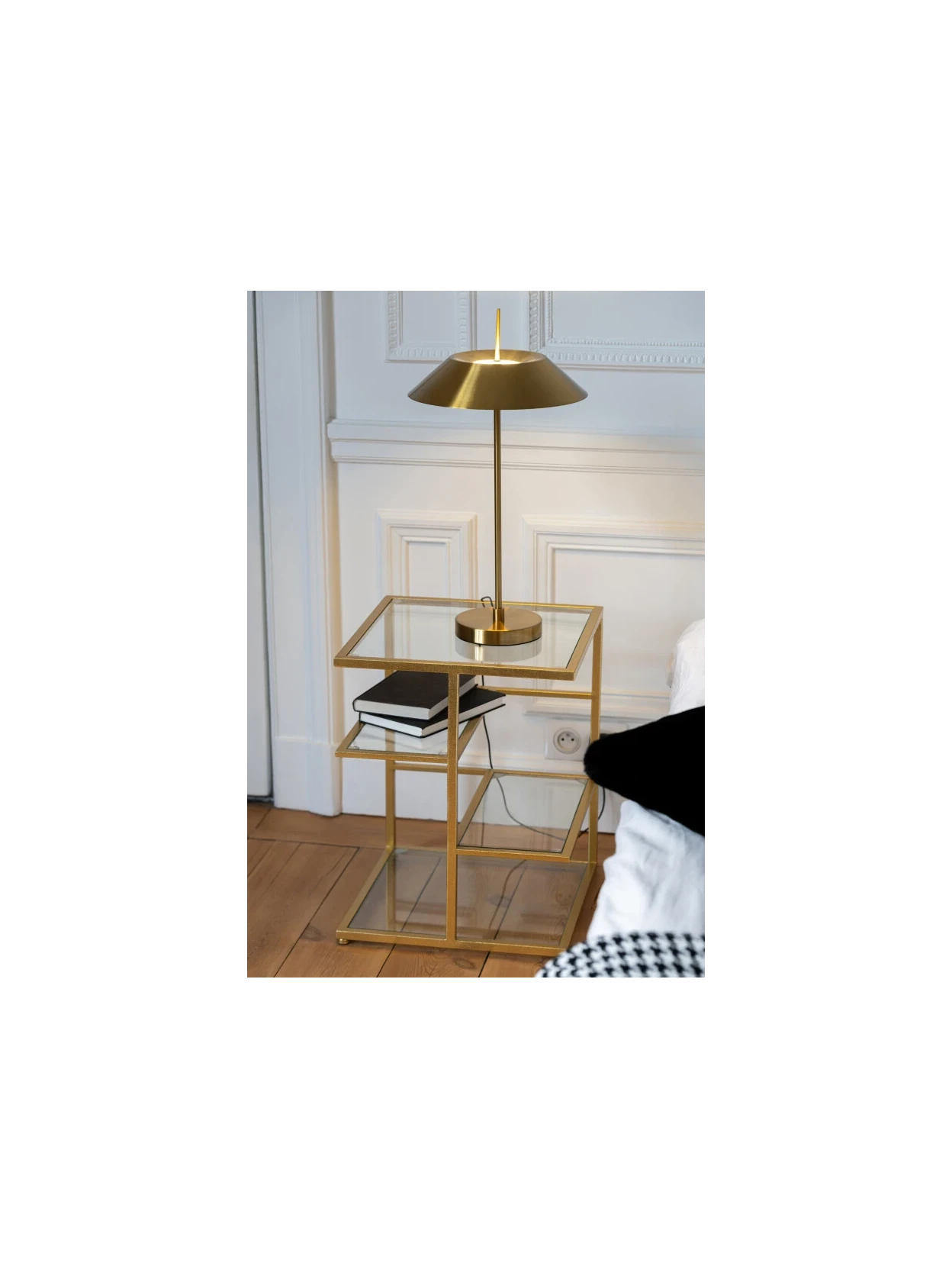 Tavolino dal design raffinato che unisce stile e funzionalità. Le linee geometriche e il design essenziale lo rendono un complemento d'arredo raffinato e versatile. Adatto sia come tavolino da salotto che come comodino in camera da letto. La struttura in metallo dorato dona un tocco glam, mentre i ripiani in vetro aggiungono leggerezza visiva e praticità. Ideale per ambienti dal carattere modreno, minimal o sofisticato.