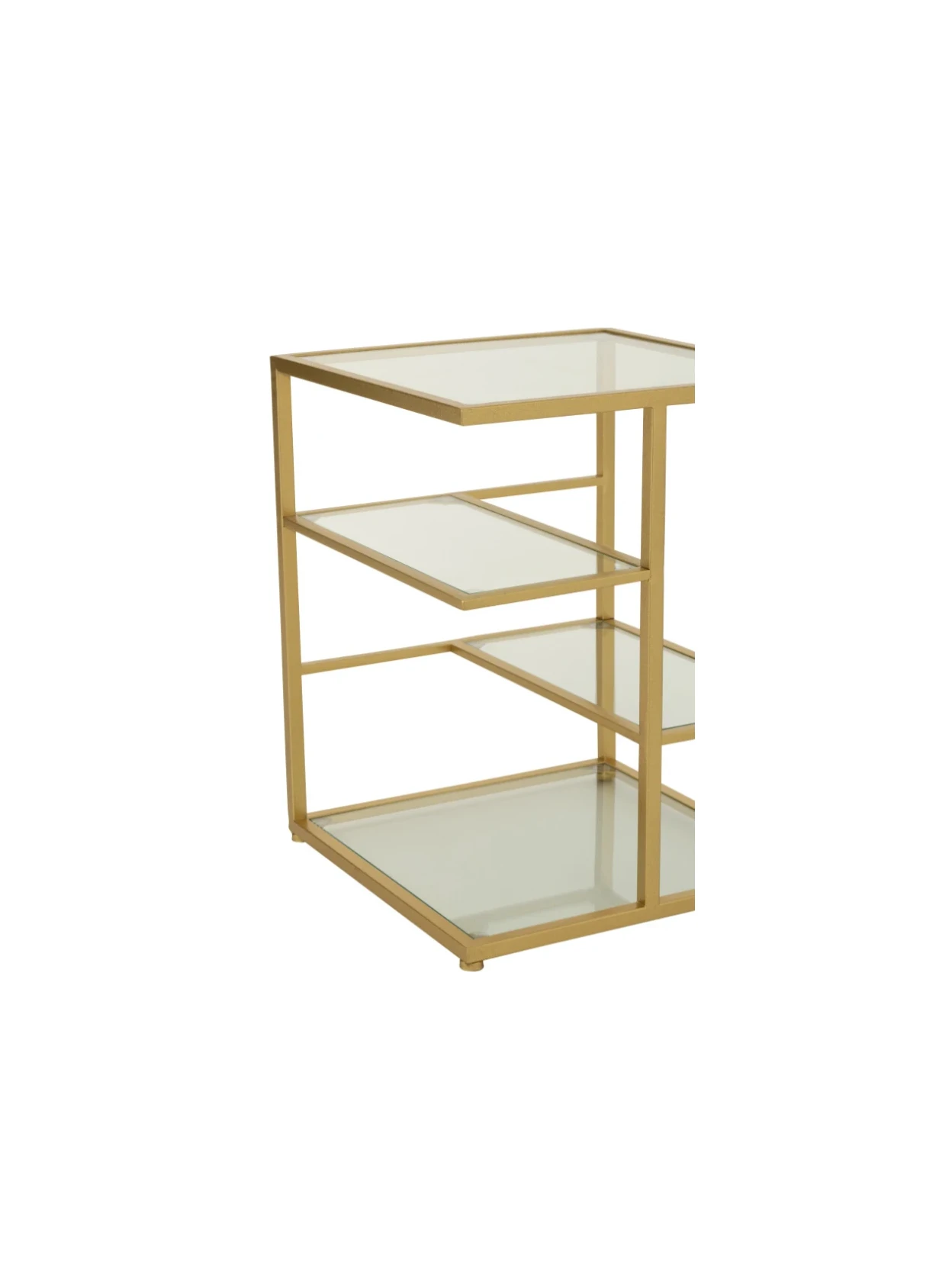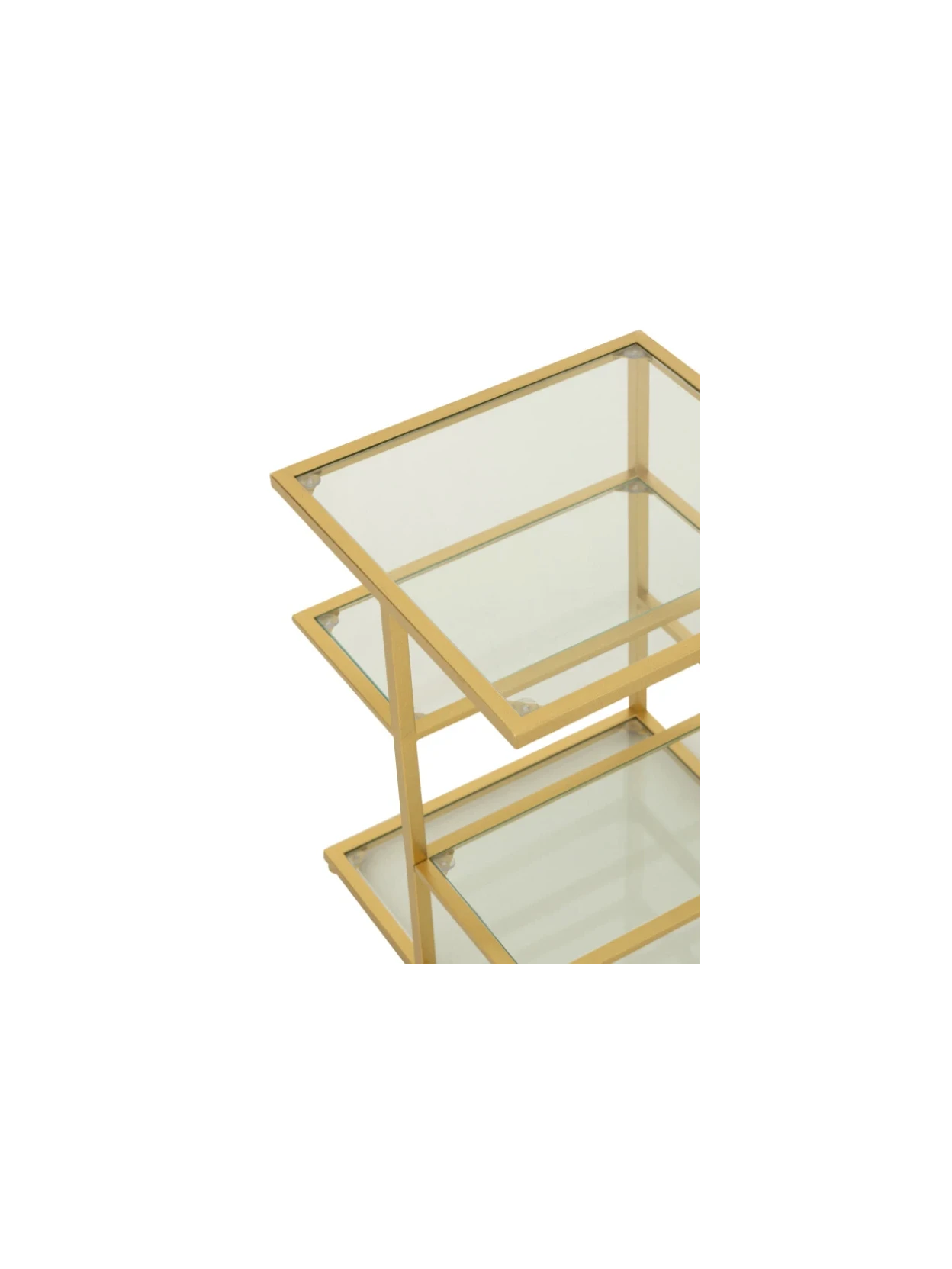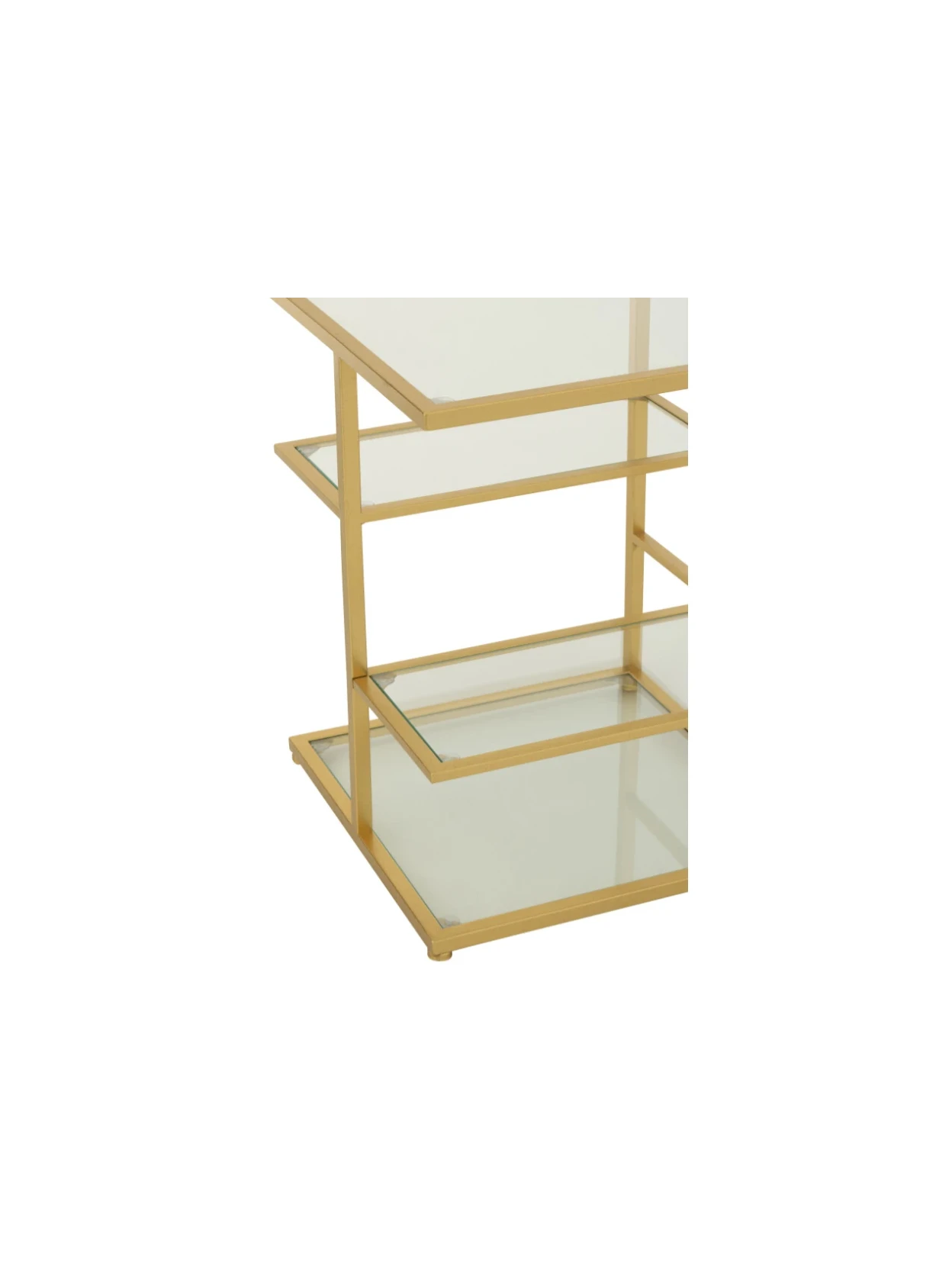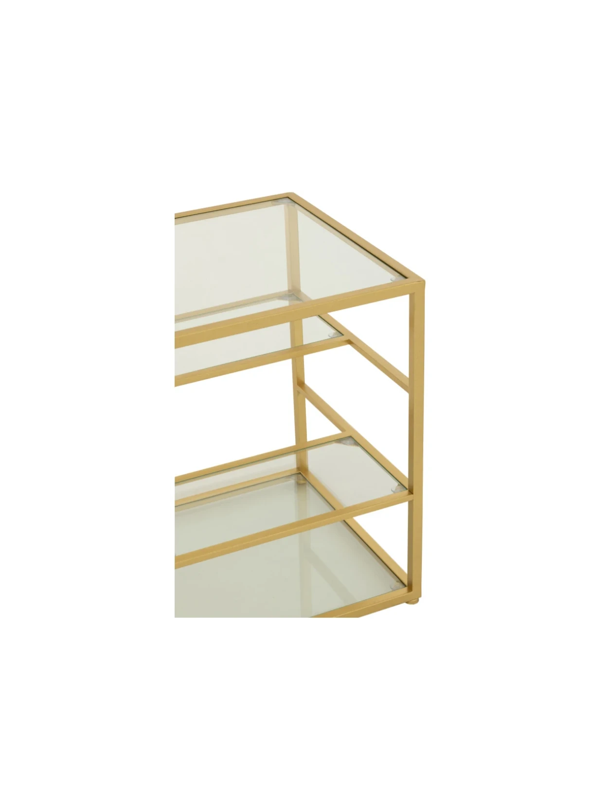 Il design minimal ed elegante e la lucentezza del vetro si incontrano in questo tavolino. Caratterizzato da una struttura in metallo dorato e ripiani in vetro trasparente è il complemento perfetto per arredare casa con stile.