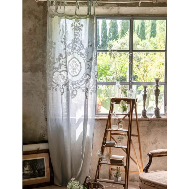 Elegante tenda in puro lino azzurro-grigio, con medaglione centrale bianco naturale e raffinati ricami. Perfetta per ambienti shabby chic e provenzali, si fissa facilmente ai bastoni con i pratici lacci, lasciando cadere morbidi drappeggi o delicati fiocchetti.