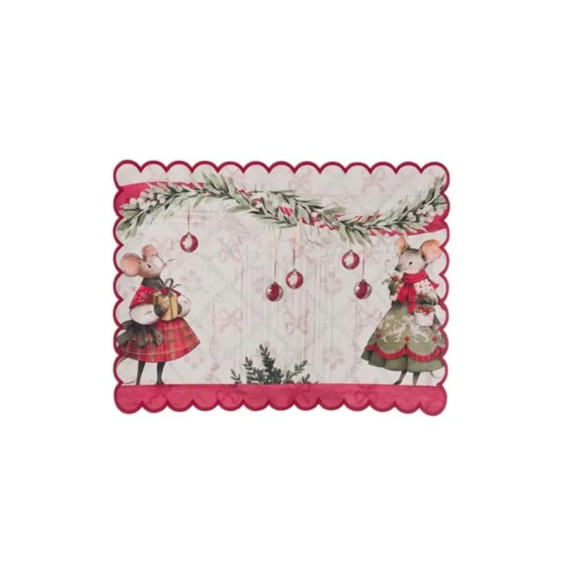 Tovaglietta firmata Blanc MariClò della collezione Favola di Natale realizzata in 100% cotone beige con bordo merlettato rosso che raffigura due topini che si scambiano i regali.