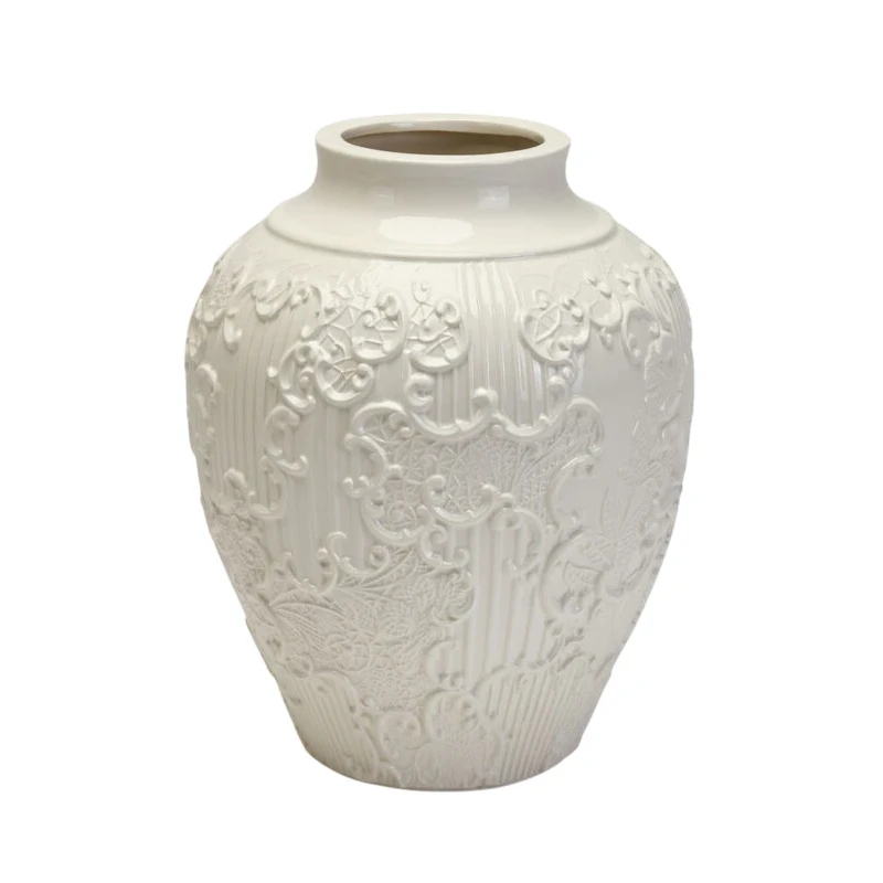 Vaso Dentelle firmato Henriette. In ceramica bianca con raffinati dettagli decorativi, esprime eleganza e delicatezza.