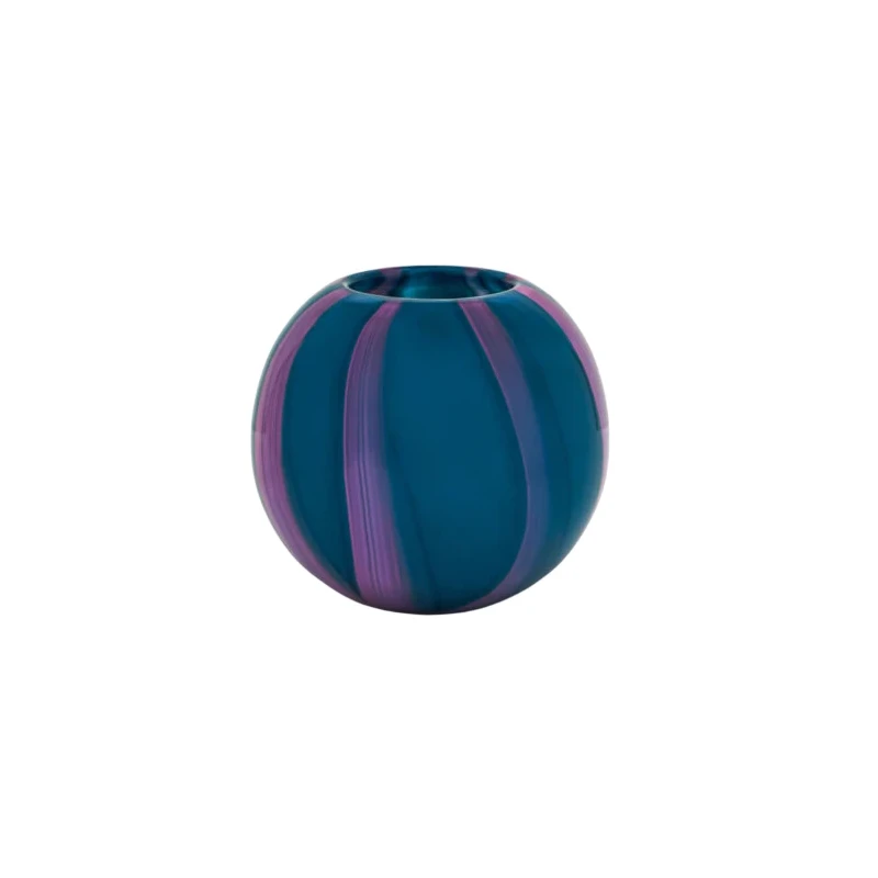 Elegante vaso decorativo in vetro soffiato, dimensioni 17x17 cm, con raffinate sfumature blu e viola che valorizzano ogni ambiente.