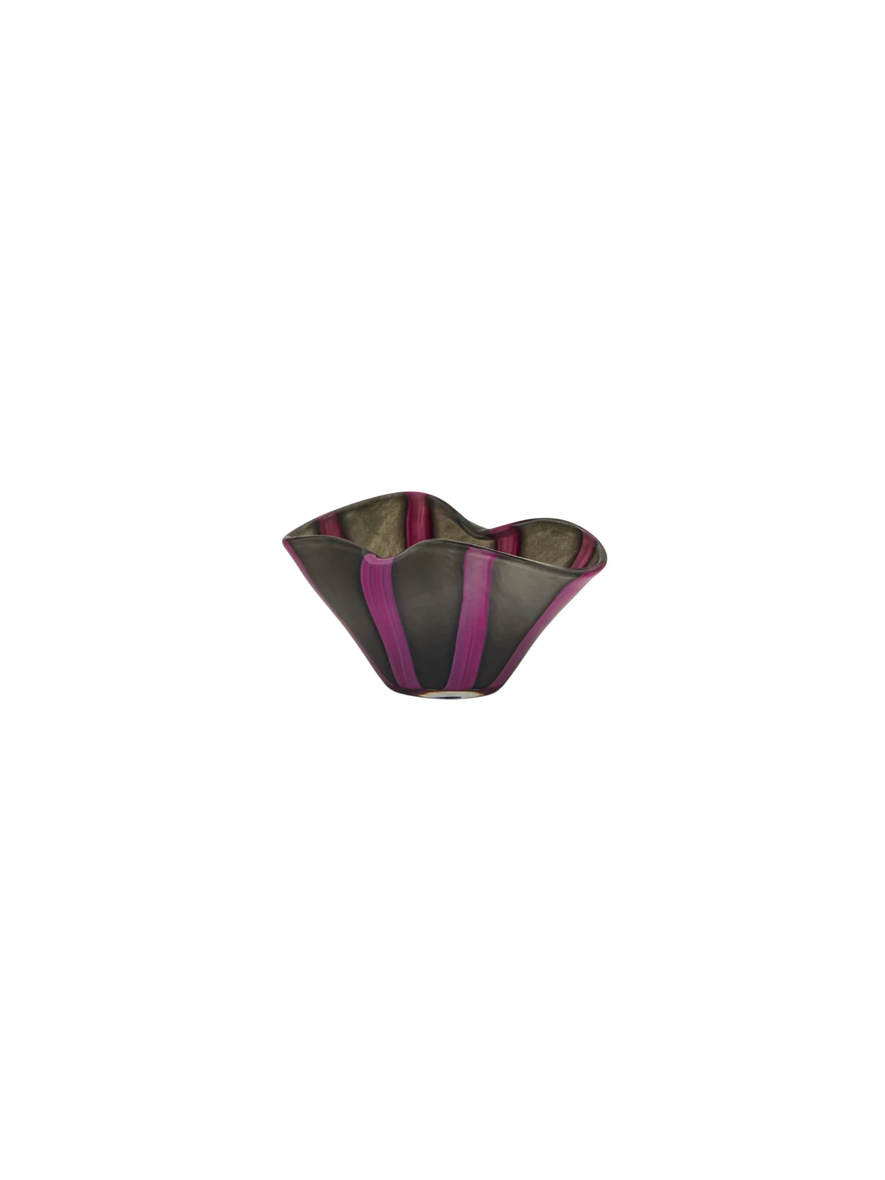 Elegante coppa decorativa in vetro soffiato, dimensioni 25x11 cm, con raffinate tonalità grigio e viola per un tocco di stile contemporaneo.