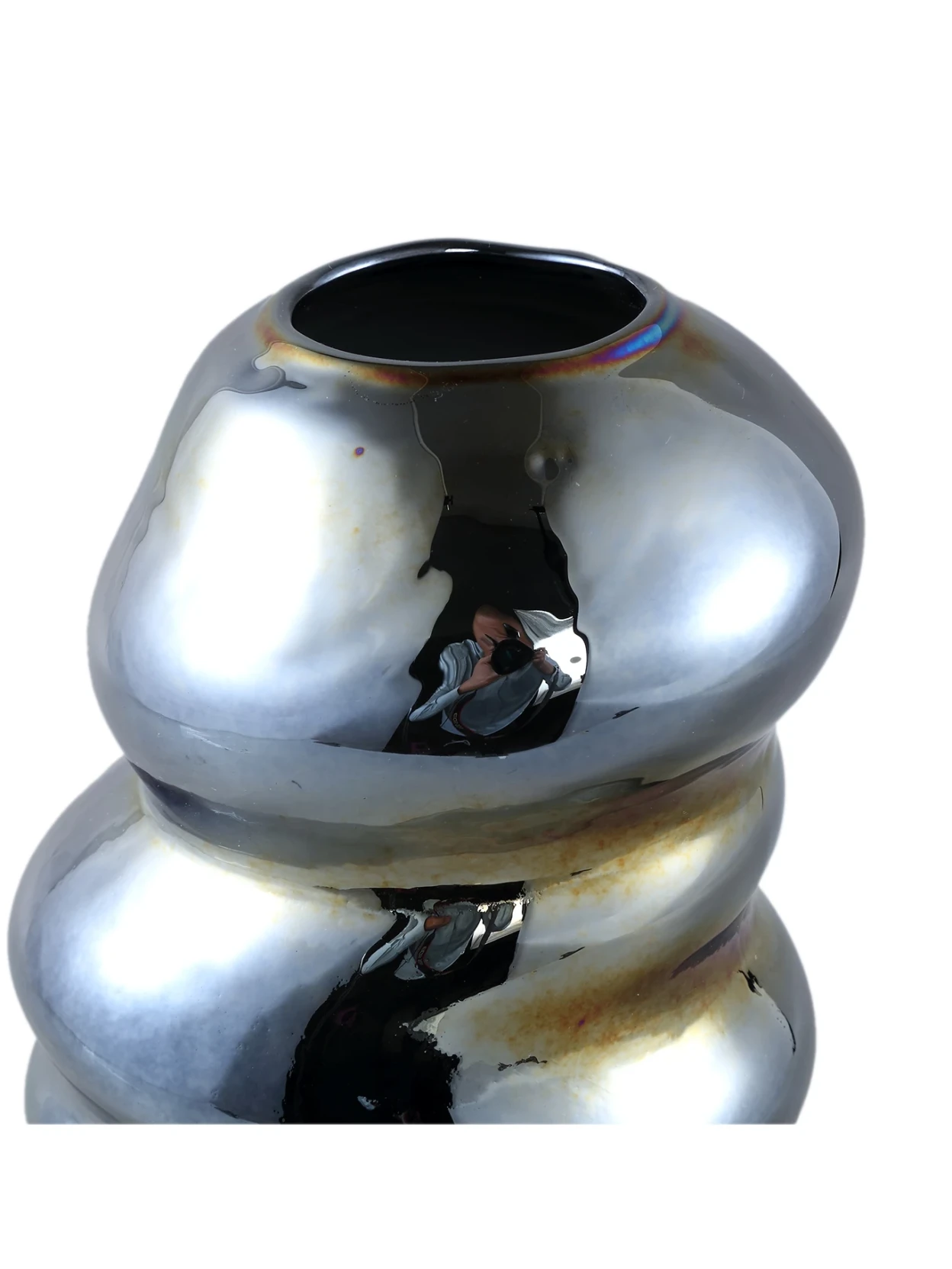 Vaso in vetro soffiato Orietta blu dall’effetto oleoso e finitura ondulata. Realizzato a mano, questo vaso rotondo da H 31,5 cm unisce eleganza e artigianalità per valorizzare ogni ambiente moderno o classico.